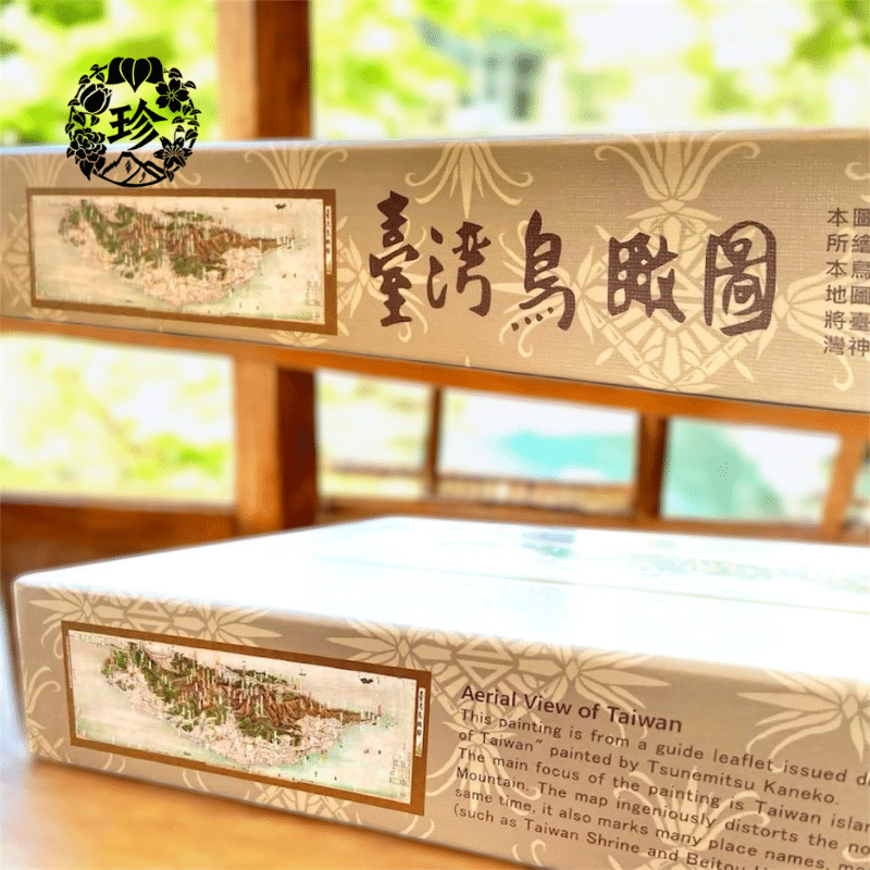 本製品は台湾島を台湾海峡の方角から中央山脈の方向、すなわち西から東へ見た鳥瞰図です。北東に沖縄、神戸、東京などの場所が見えて、歪みが若干大きいです。一方、図面には台湾の地名や山脈、河川、交通ルート、産業及び名所(台湾神社や北投温泉など)が標記されています。