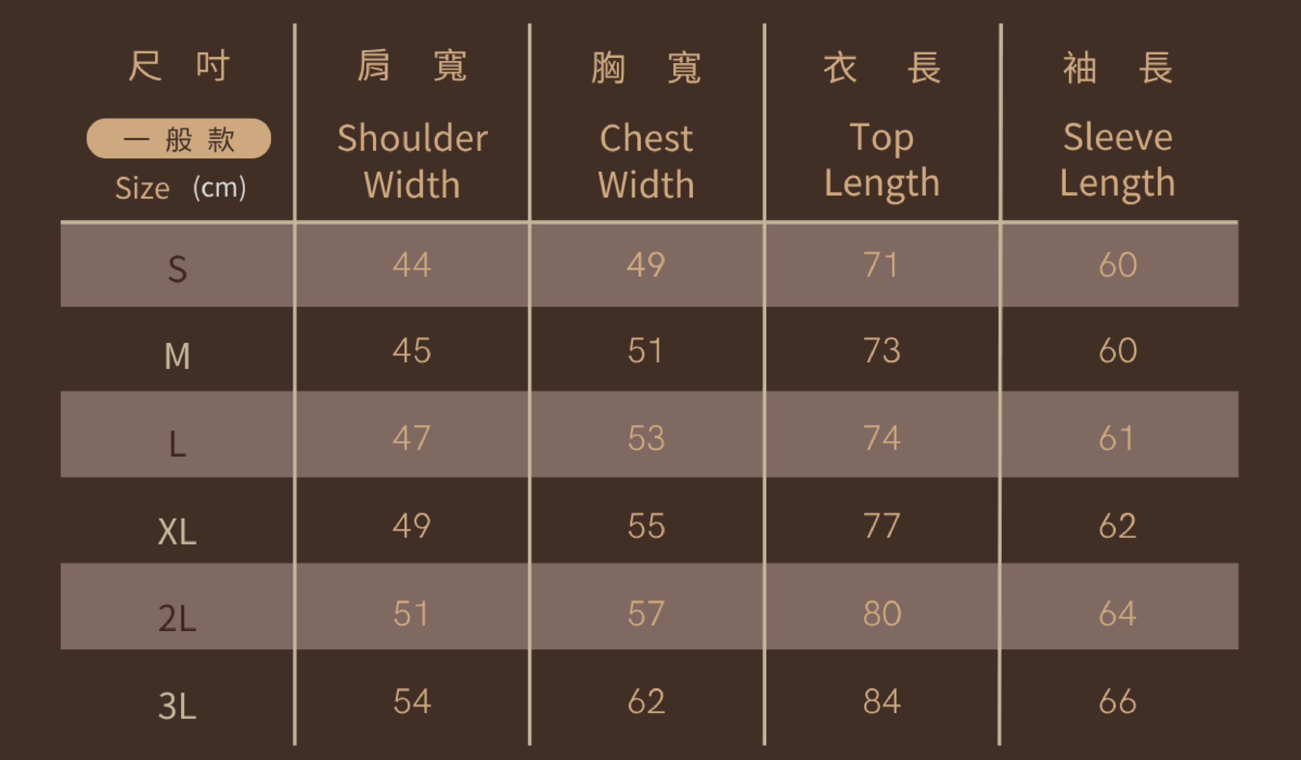 S, M, L, XL, 2L, 3L