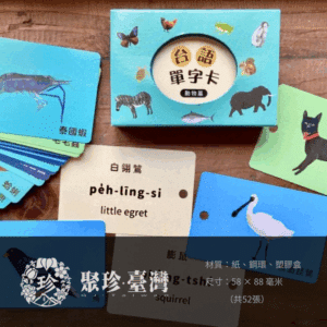 內含50張雙面單字卡(正面圖案、背面漢字/台羅拼音/英語)、卡牌收納盒、卡牌攜帶鋼環