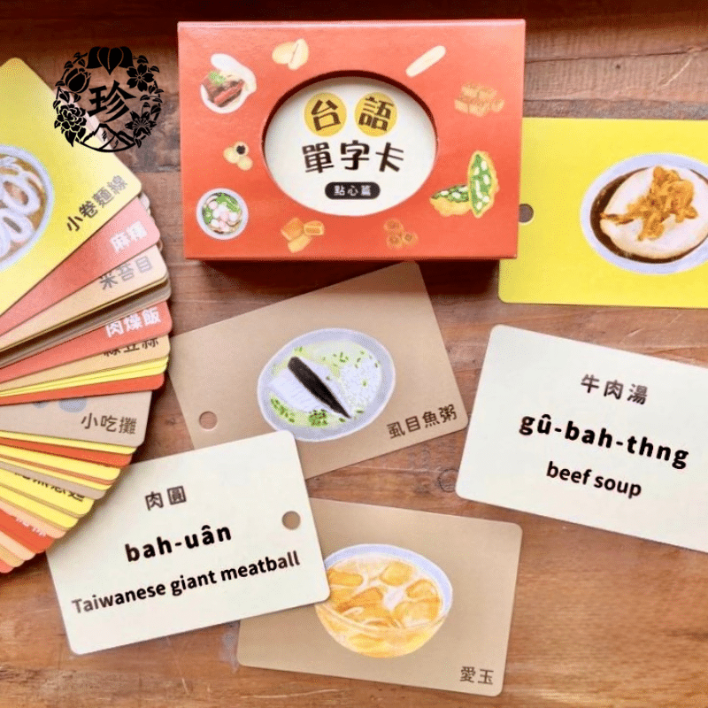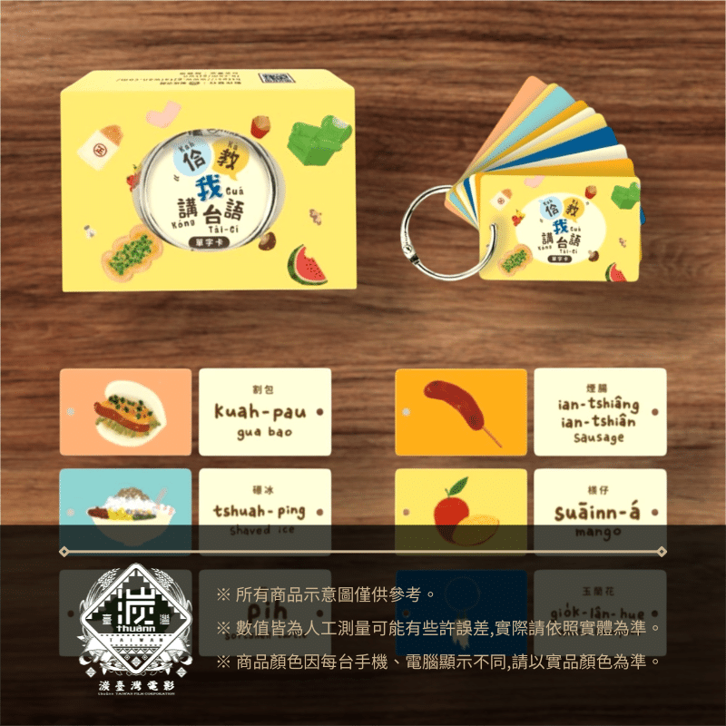 內含50張雙面單字卡(正面圖案、背面漢字/台羅拼音/英語)、卡牌收納盒、卡牌攜帶鋼環