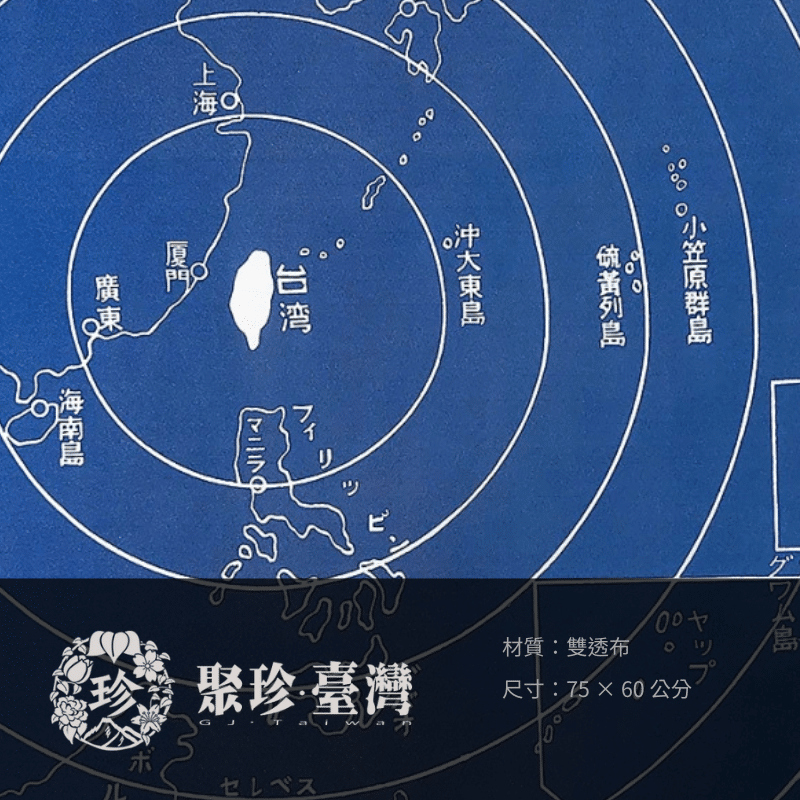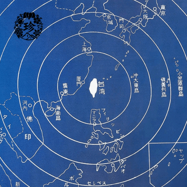 日本時代將臺灣視為東亞中心,圖為西元1928年發行刊物中附圖收錄之〈臺灣—東亞中心圖〉,以臺灣為中心畫出一圈圈同心圓,並標出各地之重要城市。